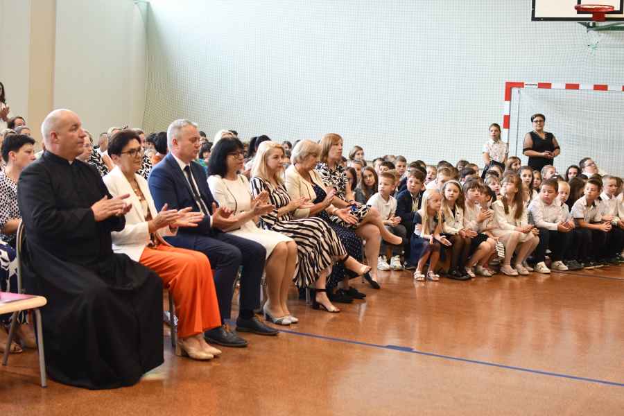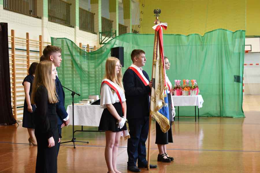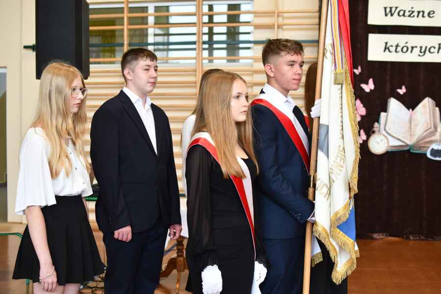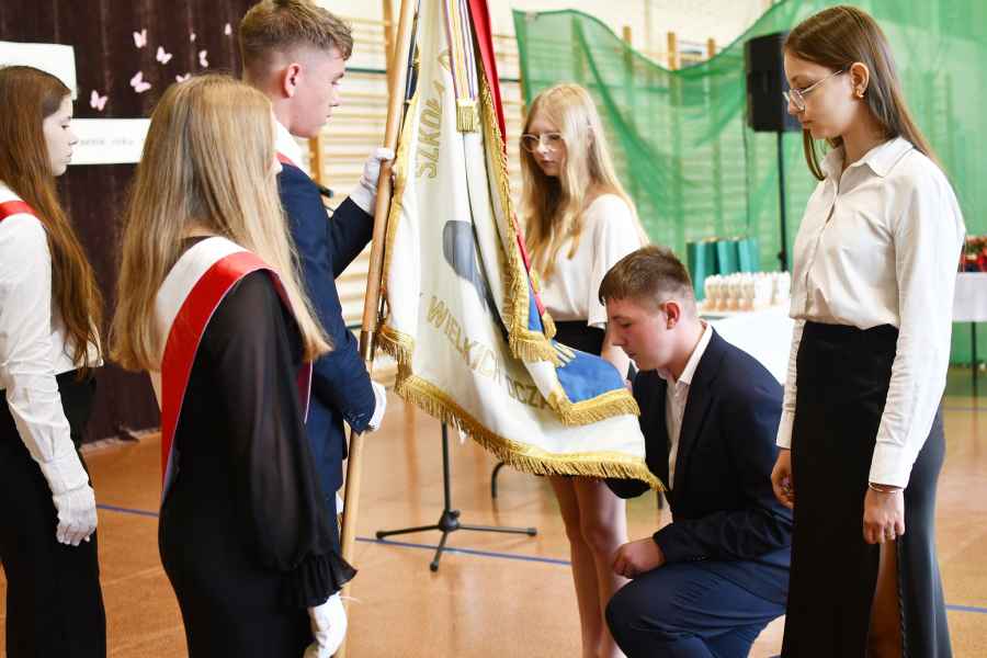 Jednym z ważniejszych momentów ceremonii było przekazanie sztandaru szkoły – uczniowie klasy VIII, którzy kończą naukę w placówce, symbolicznie oddali go swoim młodszym kolegom, podkreślając ciągłość tradycji i wartości pielęgnowanych w szkole.