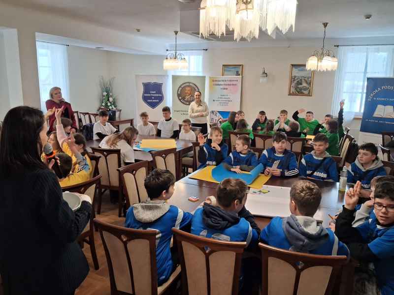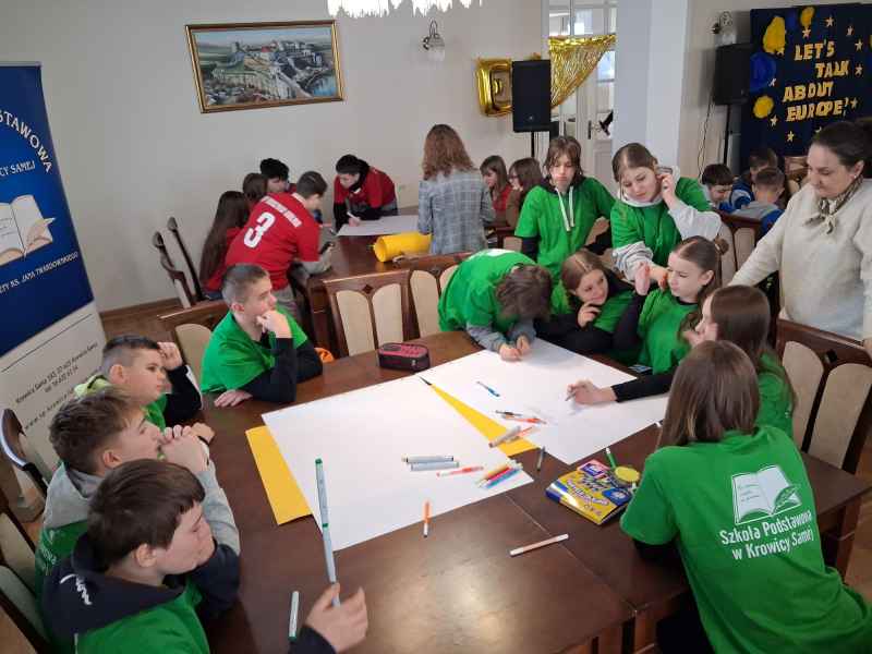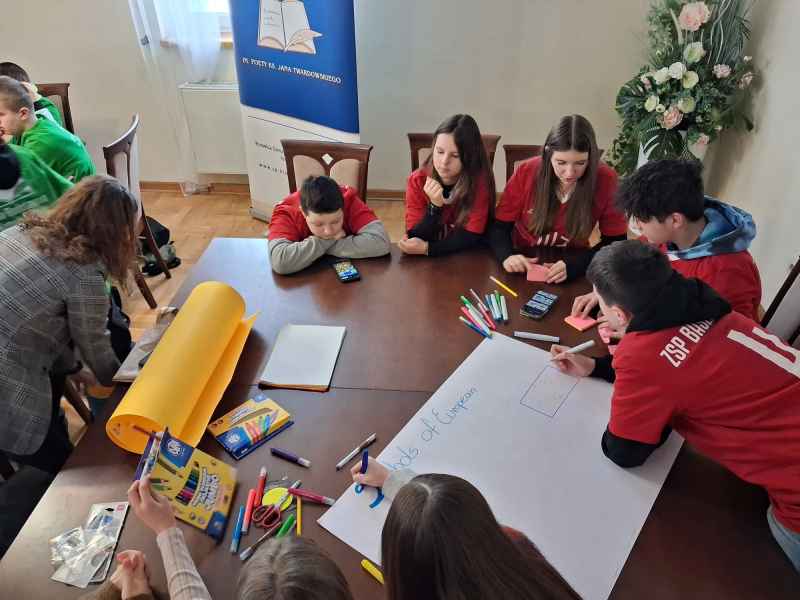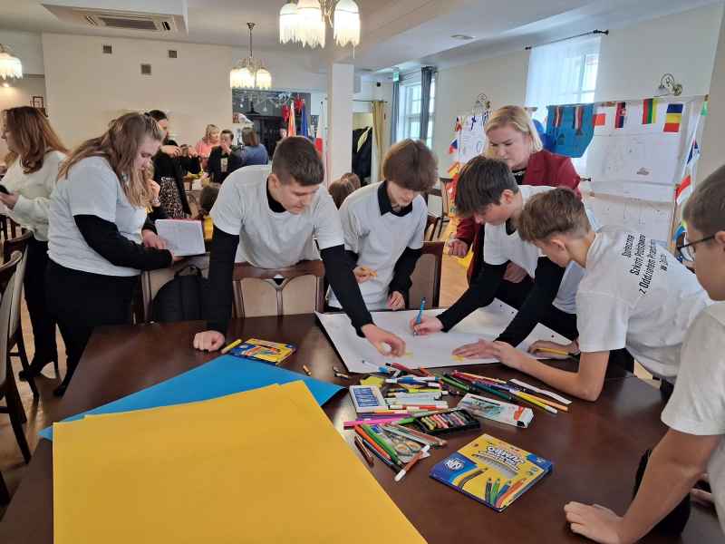 Integralną częścią spotkania były również działania kreatywne. Uczniowie przedstawiali własne wizje Europy, odwołując się do idei jedności, pokoju, rozwoju oraz odpowiedzialności za środowisko naturalne. Forma pracy sprzyjała aktywnemu udziałowi młodzieży i wymianie poglądów.