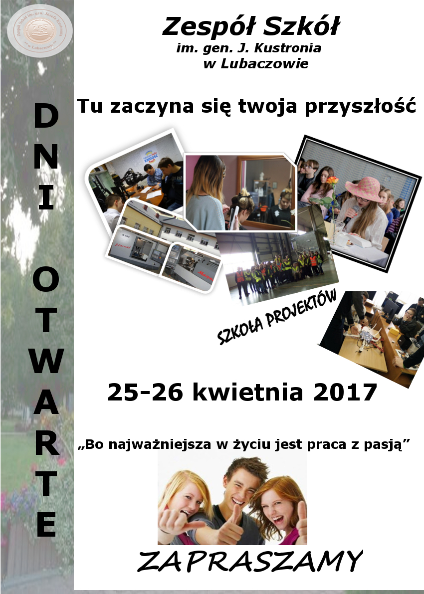 Jaką szkołę wybrać po gimnazjum? W jaki sposób mogę ocenić jakie mam predyspozycje? Co mnie interesuje, jakie mam talenty i umiejętności? Z tymi i podobnymi dylematami zaprasza wszystkich uczniów i rodziców na dni otwarte Zespół Szkół im gen. J. Kustronia w Lubaczowie w dniach 25-26 kwietnia 2017r.
