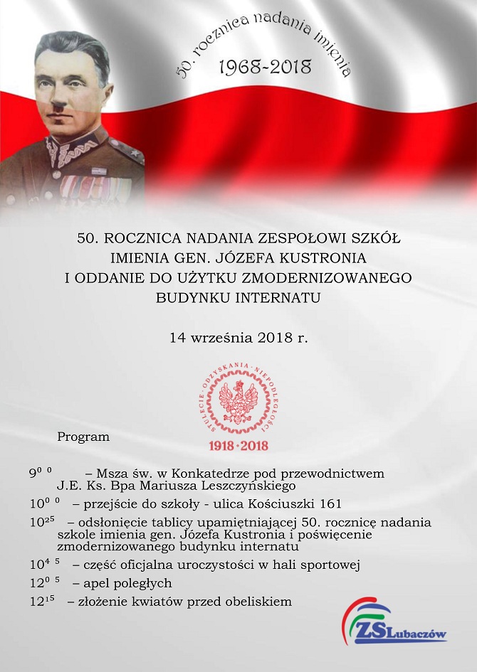 W piątek 14 września odbędą się uroczystości związane z 50 rocznicą nadania Zespołowi Szkół imienia gen. Józefa Kustronia połączone z oddaniem do użytku zmodernizowanego budynku internatu.