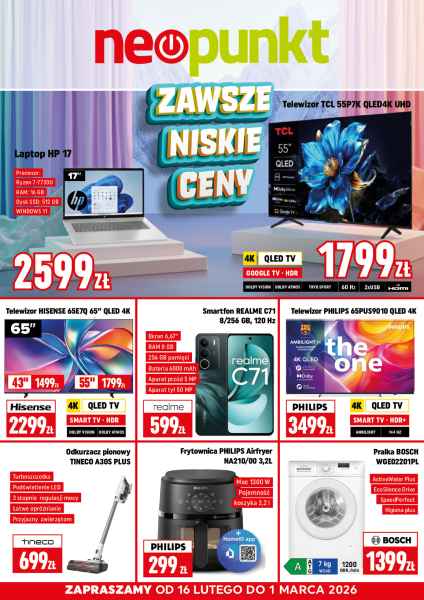 W sklepach Euro / Neopunkt ruszyła nowa akcja promocyjna pod hasłem „Zawsze niskie ceny”. Oferta obowiązuje od 16 lutego do 1 marca 2026 roku i obejmuje wybrane telewizory, AGD oraz elektronikę użytkową.