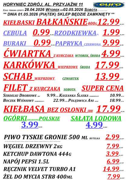 Przed majówką sklepy Euro przygotowały nową gazetkę z promocjami na produkty, które najczęściej trafiają do koszyka przed długim weekendem. W ofercie pojawiły się tańsze mięsa, warzywa, dodatki na grilla i produkty na szybkie zakupy przed 1 maja.