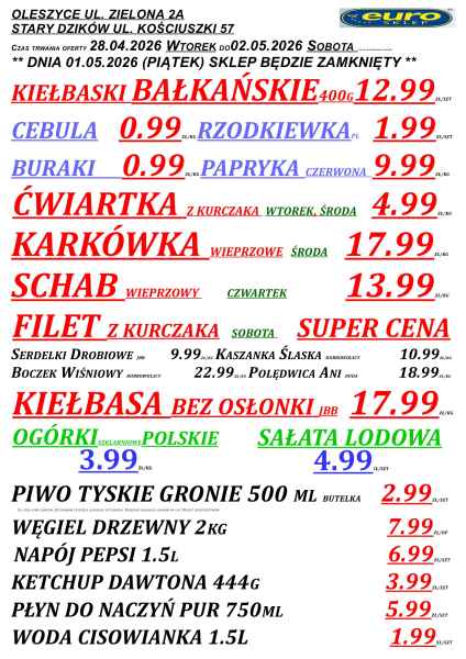 Nowa gazetka obowiązuje w sklepach Euro w Cieszanowie, Horyńcu-Zdroju, Lubaczowie, Oleszycach i Starym Dzikowie. Oferta potrwa do soboty, 2 maja, lub do wyczerpania zapasów. Warto pamiętać, że 1 maja sklepy będą zamknięte.
