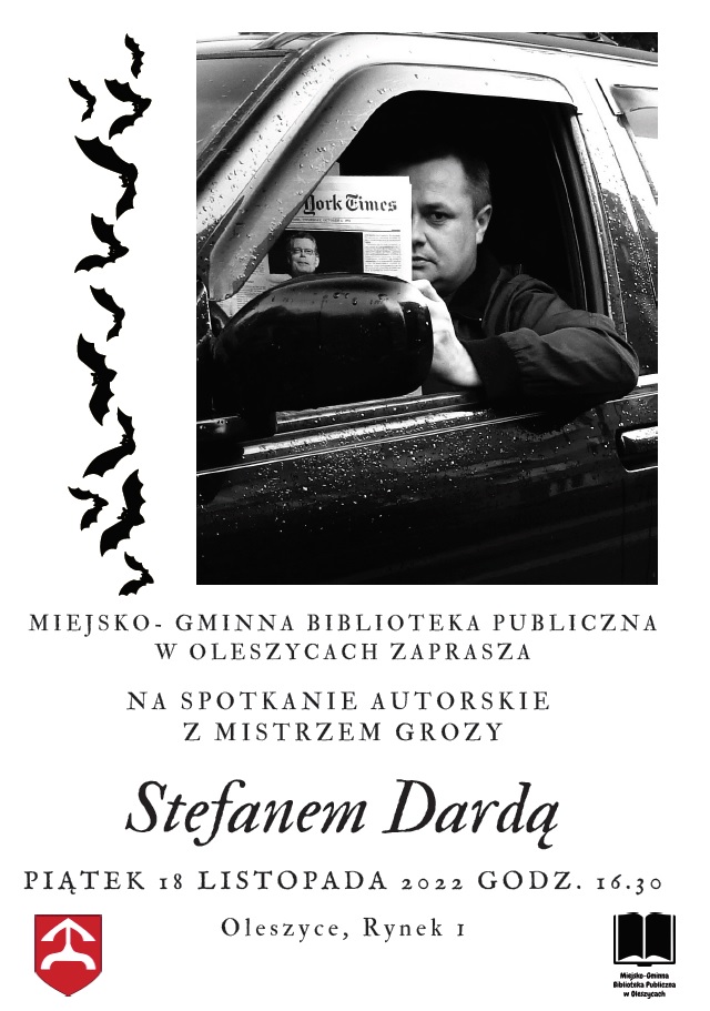 MGBP w Oleszycach zaprasza na spotkanie z mistrzem grozy Stefanem Dardą, które odbędzie się w bibliotece w budynku Ratusza w Oleszycach, w dniu 18 listopada 2022 r. o godzinie 16.30.