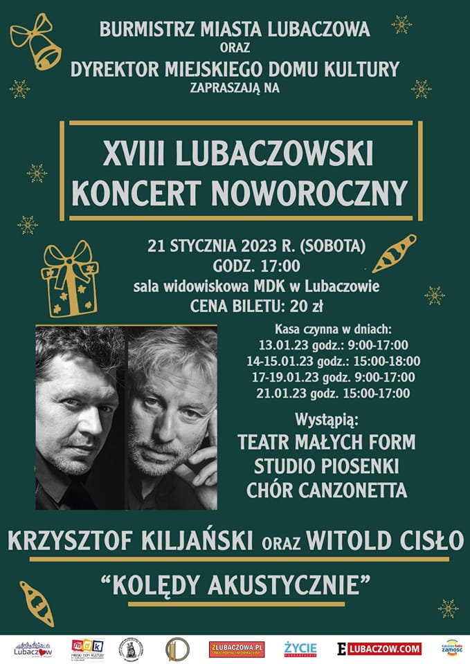 W sobotę 22 stycznia w Lubaczowie po raz osiemnasty odbędzie się Lubaczowski Koncert Noworoczny. To wydarzenie, które od lat przyciąga tłumy widzów. W tym roku gwiazdą wieczoru będzie m.in. Krzysztof Kiljański.