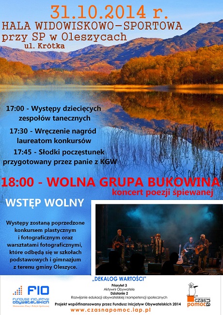 31 października w Oleszycach odbędzie się koncert poezji śpiewanej w wykonaniu zespołu "Wolna Grupa Bukowina". Oprócz tego organizatorzy o godzinie 17:00 zapraszają na występy dziecięcych zespołów tanecznych. Dla gości przygotowany jest także słodki poczęstunek.