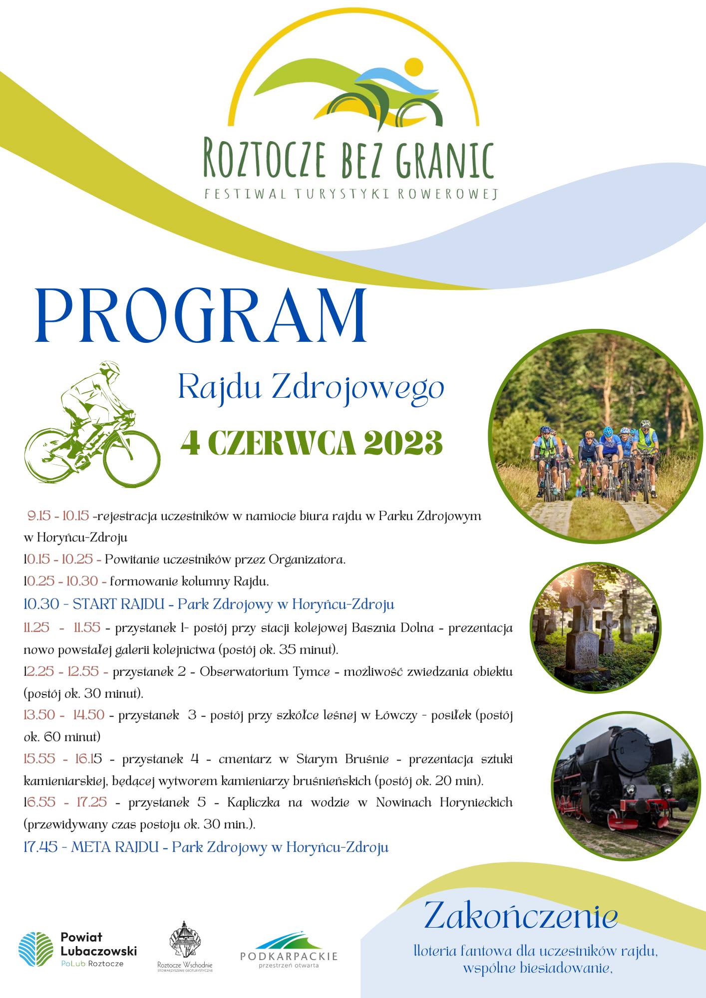 Natomiast w dniu 4 czerwca odbędzie się „Rajd Zdrojowy” wokół uzdrowiskowej perły Roztocza- Horyńca Zdroju. Po starcie z Parku Zdrojowego w Horyńcu-Zdroju uczestnicy przejadą do stacji kolejowej Basznia Dolna i obserwatorium astronomicznego w Tymcach, a następnie przez Łówczę i Stare Brusno- nieistniejącą już wieś, będąca centrum znanego bruśnieńskiego ośrodka kamieniarskiego- do Kapliczki na wodzie w Nowinach Horynieckich, a stamtąd-orzeźwieni cudowną wodą- na metę w Parku Zdrojowym w Horyńcu. Na zakończenie rajdu wśród uczestników zostanie przeprowadzona loteria fantowa, z kolejnym rowerem do wygrania.