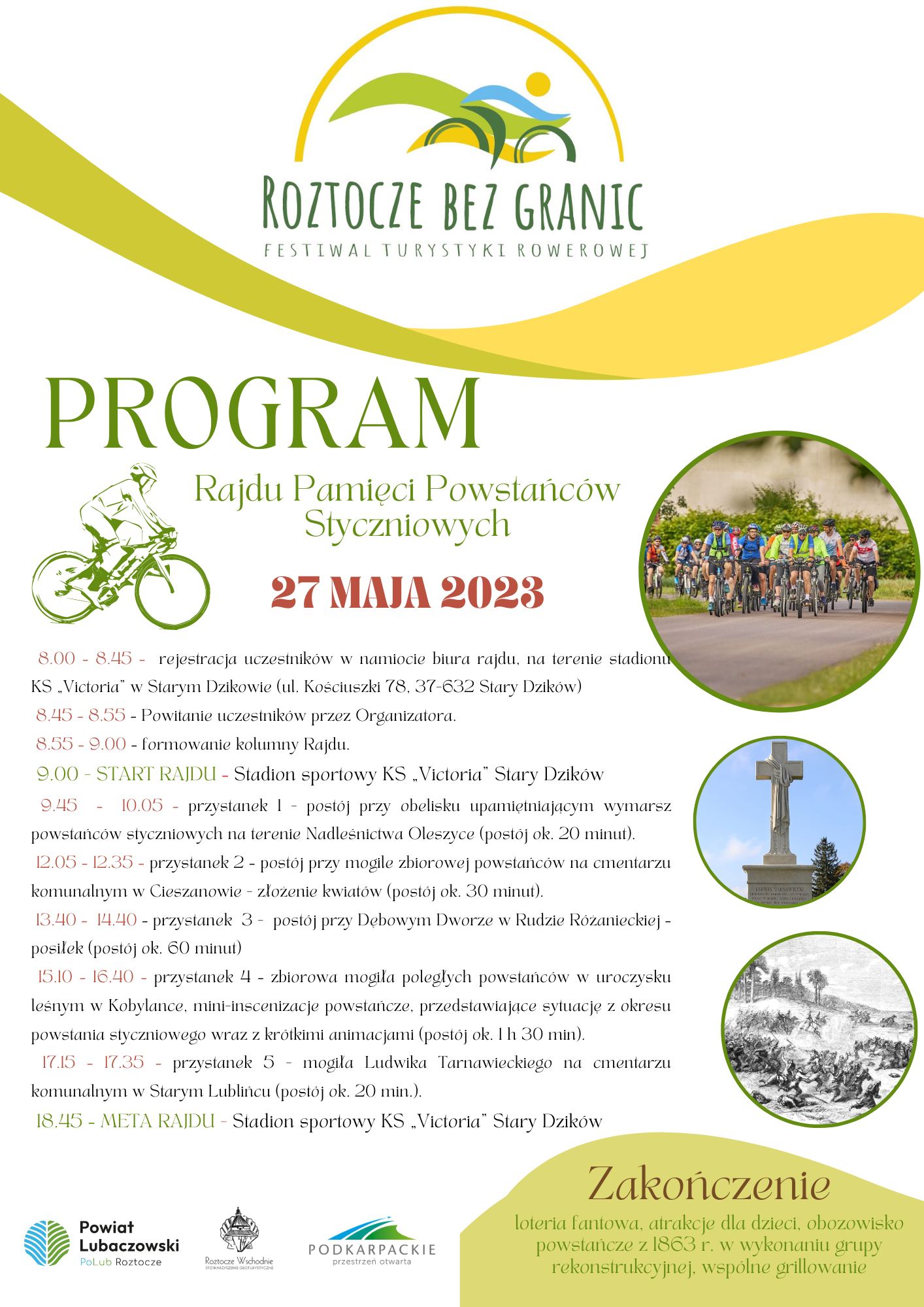 Festiwal rozpocznie się 27 maja „Rajdem pamięci Powstańców Styczniowych”, którego trasa wiedzie ze stadionu w Starym Dzikowie przez miejsce koncentracji i wymarszu oddziałów powstańczych, obecnie na terenie lasów Nadleśnictwa Oleszyce- Leśnictwa Czerniakowa Buda, następnie przez Cieszanów, Rudę Różaniecką do uroczyska Kobylanka, gdzie zostały stoczone jedne z największych bitew leśnych w czasie całego powstania. Zostaną tam upamiętnieni polegli powstańcy. Na trasie będzie także można spotkać wojska carskie, które zechcą przeszkodzić w przejechaniu trasy, jak i oddziały powstańcze…. Meta w Starym Dzikowie, gdzie na przybyłych uczestników rajdu, ale również mieszkańców i wszystkich zaineresowanych, będzie czekało obozowisko z czasów powstańczych, a w nim pokazy broni, umundurowania i ubrań cywilnych. Na zakończenie rajdu- wśród jego uczestników- w loterii fantowej zostaną rozlosowane cenne nagrody, w tym rower trekkingowy.