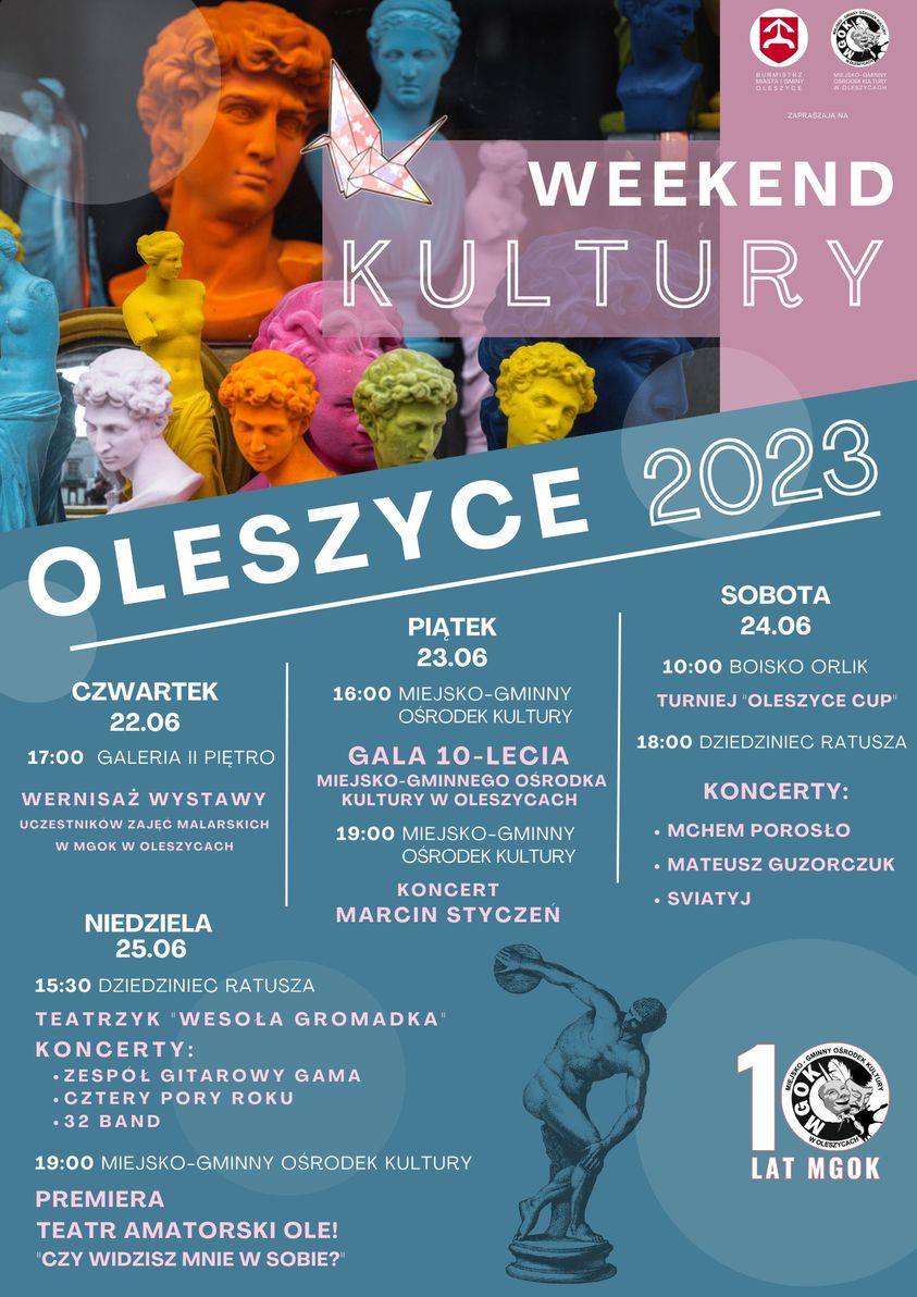 Wydarzenie rozpocznie się w czwartek (22.06) wernisażem wystawy uczestników zajęć malarskich w MGOK w Oleszycach. Dzień później swoje 10-lecie będzie swiętować Miejsko-Gminny Ośrodek Kultury w Oleszycach. W ramach tego wydarzenia wieczorem odbędzie się koncert Marcina Stycznia. W sobotę zostanie zorganizowany turniej piłki nożnej "Oleszyce Cup", a od godz. 18:00 na dziedzińcu Ratusza Miejskiego zagrają: Mchem Porosło, Mateusz Guzorczuk oraz Sviatyj.