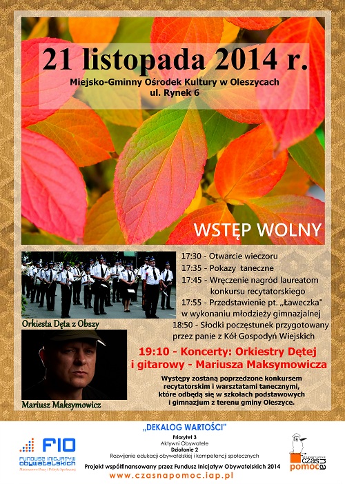 Pokazy taneczne, przedstawienie w wykonaniu młodzieży gimnazjalnej oraz koncerty Orkiestry Dętej i Mariusza Maksymowicza, takie atrakcje przygotowali organizatorzy projektu "Dekalog wartości". Początek o godzinie 17:30 w Miejsko-Gminnym Ośrodku Kultury w Oleszycach.