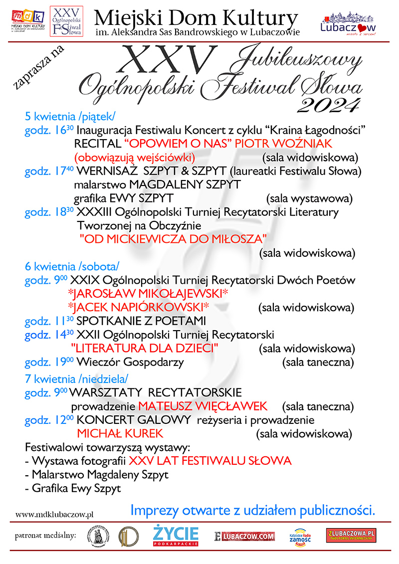 Już 5 kwietnia w Miejskim Domu Kultury w Lubaczowie odbędzie się XIV edycja Ogólnopolskiego Festiwalu Słowa. W tym roku organizatorzy przygotowali szereg ciekawych artystycznych wydarzeń.