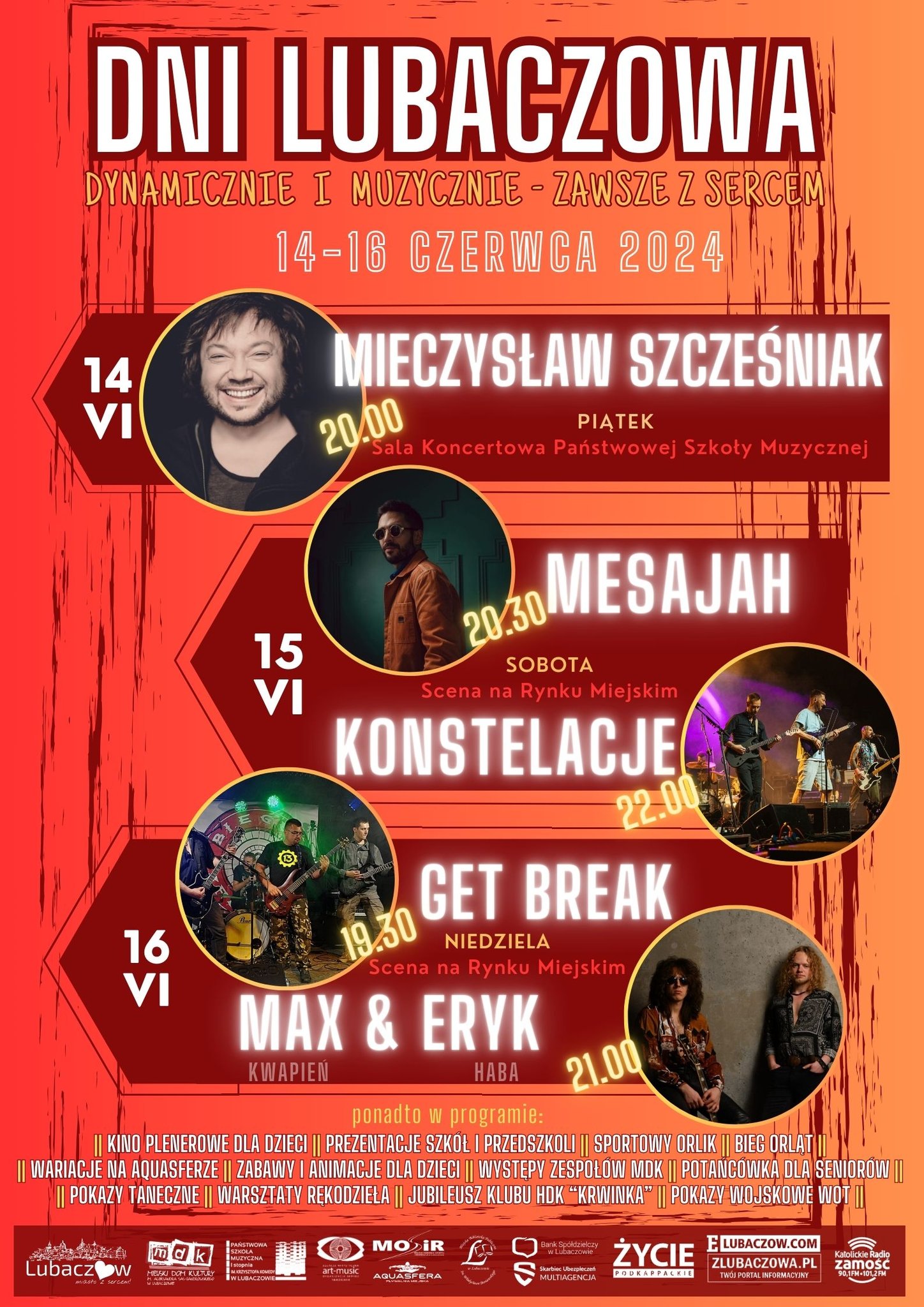W tym roku Dni Lubaczowa odbędą się w dniach 14 - 16 czerwca pod hasłem „Dynamicznie i muzycznie - zawsze z sercem”. Na lubaczowskim Rynku wystąpią Mesajah, Konstelacje, Get Break oraz Max & Eryk, a w sali koncertowej Państwowej Szkoły Muzycznej zagra Mieczysław Szcześniak.