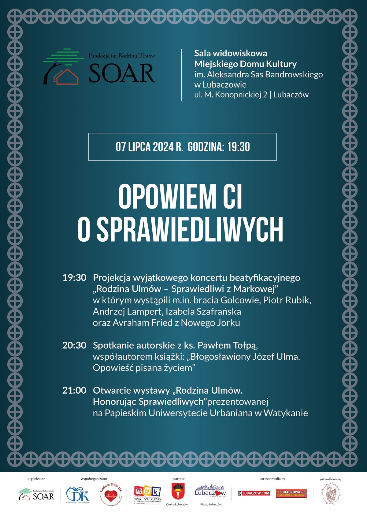 Wydarzenie „Opowiem Ci o Sprawiedliwych" składa się z trzech części: projekcji koncertu beatyfikacyjnego „Sprawiedliwi z Markowej" w ramach „Festiwalu Psalmów Dawidowych" – projektu, który prezentowany był m.in. w Rzymie, i na który zapraszał sam Papież Franciszek (wersja filmowa koncertu), a także spotkania autorskiego z ks. Pawłem Tołpą – współautorem książki „Błogosławiony Józef Ulma. Opowieść pisana życiem" (będzie możliwość zakupu książek autora) oraz prezentacji wystawy „Rodzina Ulmów. Honorując Sprawiedliwych" prezentowanej m.in. na Papieskim Uniwersytecie Urbaniana w Watykanie (21 rozkładanych rollupów).