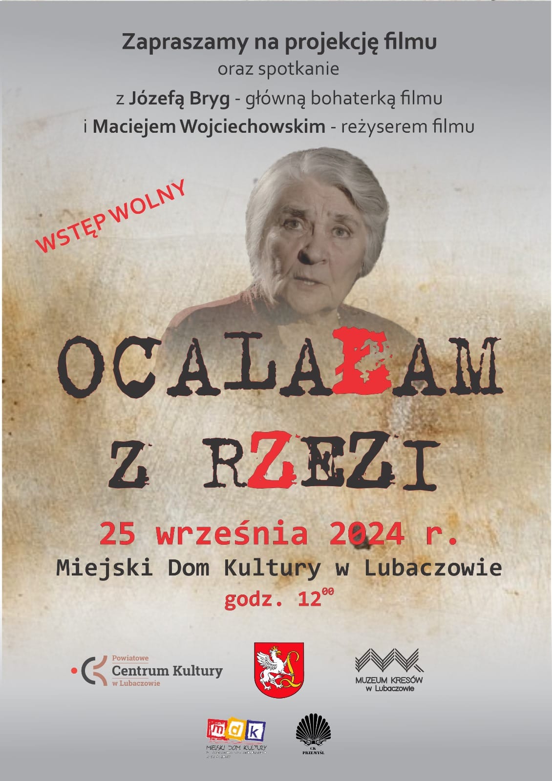Powiatowe Centrum Kultury w Lubaczowie serdecznie zaprasza na wyjątkowe wydarzenie, które odbędzie się w środę, 25 września o godz. 12.00 w Miejskim Domu Kultury im. Aleksandra Sas Bandrowskiego w Lubaczowie. W ramach spotkania zaplanowano projekcję poruszającego filmu dokumentalnego pt. „Ocalałam z rzezi”, po której odbędzie się spotkanie z Józefą Bryg – główną bohaterką filmu oraz jego reżyserem, Maciejem Wojciechowskim.