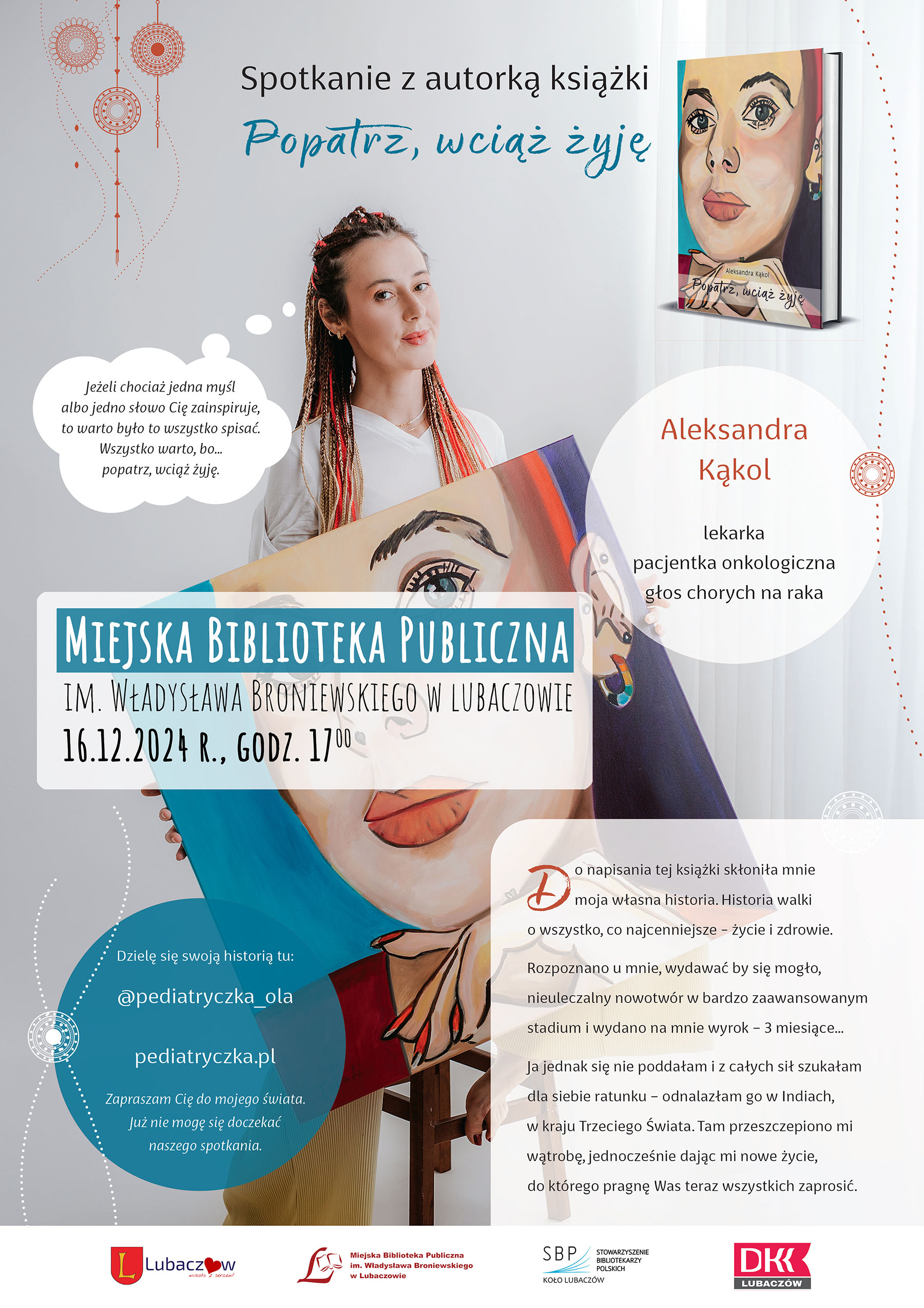 16 grudnia 2024 roku o godz. 17:00 w Wypożyczalni dla Dorosłych Miejskiej Biblioteki Publicznej im. Władysława Broniewskiego w Lubaczowie odbędzie się spotkanie z Aleksandrą Kąkol, lekarką pochodzącą z Lubaczowa, która pokonała rzadki i groźny nowotwór.