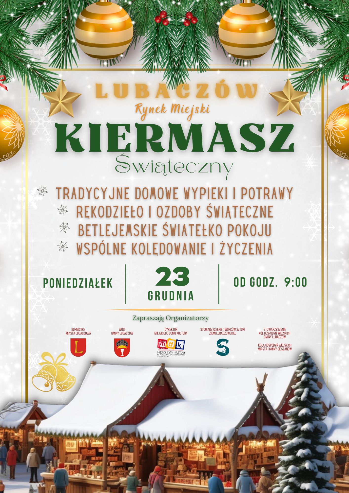 W poniedziałek 23 grudnia o godzinie 09:00 na Rynku Miejskim w Lubaczowie odbędzie się tradycyjny Kiermasz Świąteczny. Wydarzenie, które od lat cieszy się dużym zainteresowaniem mieszkańców, wprowadzi uczestników w prawdziwie świąteczny nastrój.