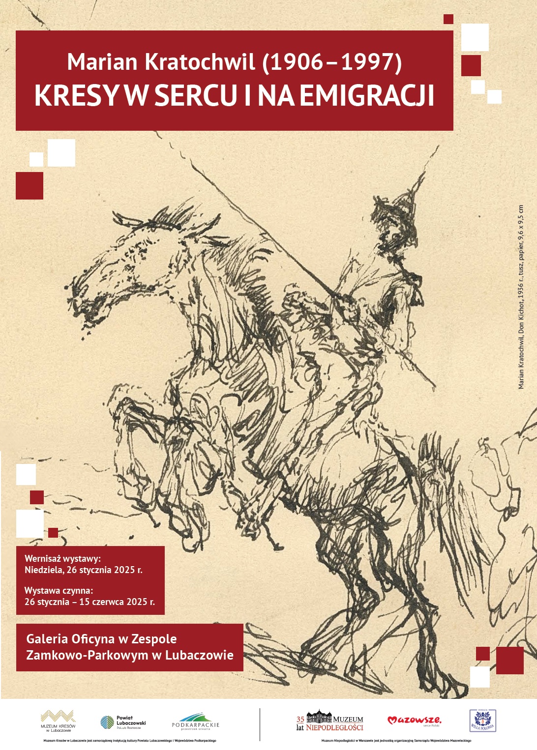 Muzeum Kresów w Lubaczowie i Muzeum Niepodległości w Warszawie zapraszają na wernisaż wystawy „Marian Kratochwil (1906–1997). Kresy w sercu i na emigracji”. Wydarzenie odbędzie się 26 stycznia o 16:00 w Galerii Oficyna w Zespole Zamkowo-Parkowym w Lubaczowie.