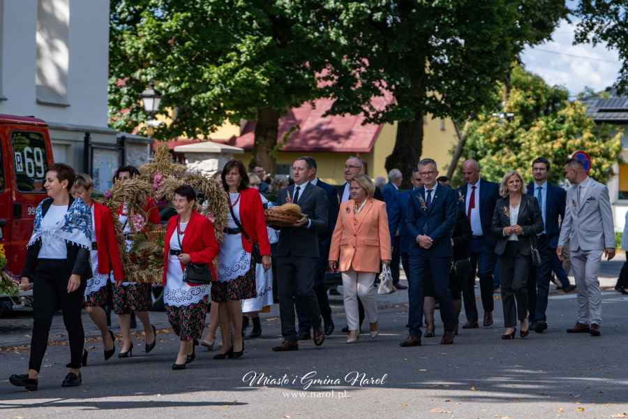 Następnie barwny korowód dożynkowy prowadzony przez Kapelę Galicjanie przeszedł na stadion miejski, gdzie odbyła się część oficjalna. Mieszkańców i gości powitali organizatorzy, a przemówienia wygłosili Burmistrz Miasta i Gminy Narol Arkadiusz Mroczek oraz Starosta Lubaczowski Barbara Broź. Burmistrz podkreślił znaczenie pracy rolników i stojące przed nimi wyzwania związane z pogodą i rynkiem, a starosta nawiązała do homilii, przywołując wspomnienia z rodzinnego domu i pracy rodziców na roli.