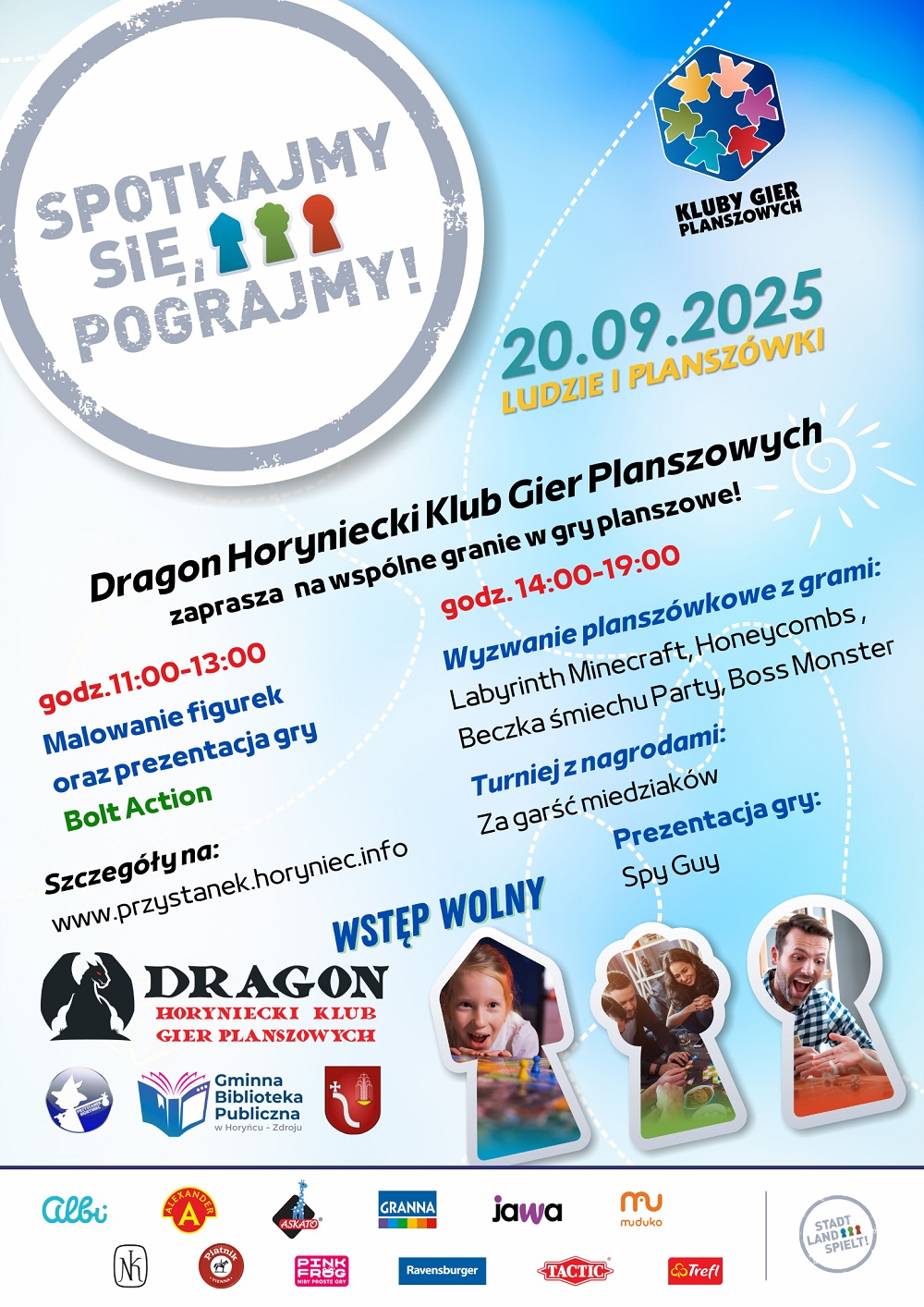 W sobotę (20.09) Gminna Biblioteka Publiczna w Horyńcu-Zdroju zamieni się w przestrzeń pełną gier, zabawy i spotkań. Horyniecki Klub Gier Planszowych DRAGON zaprasza wszystkich chętnych do wspólnego spędzenia dnia przy planszówkach.