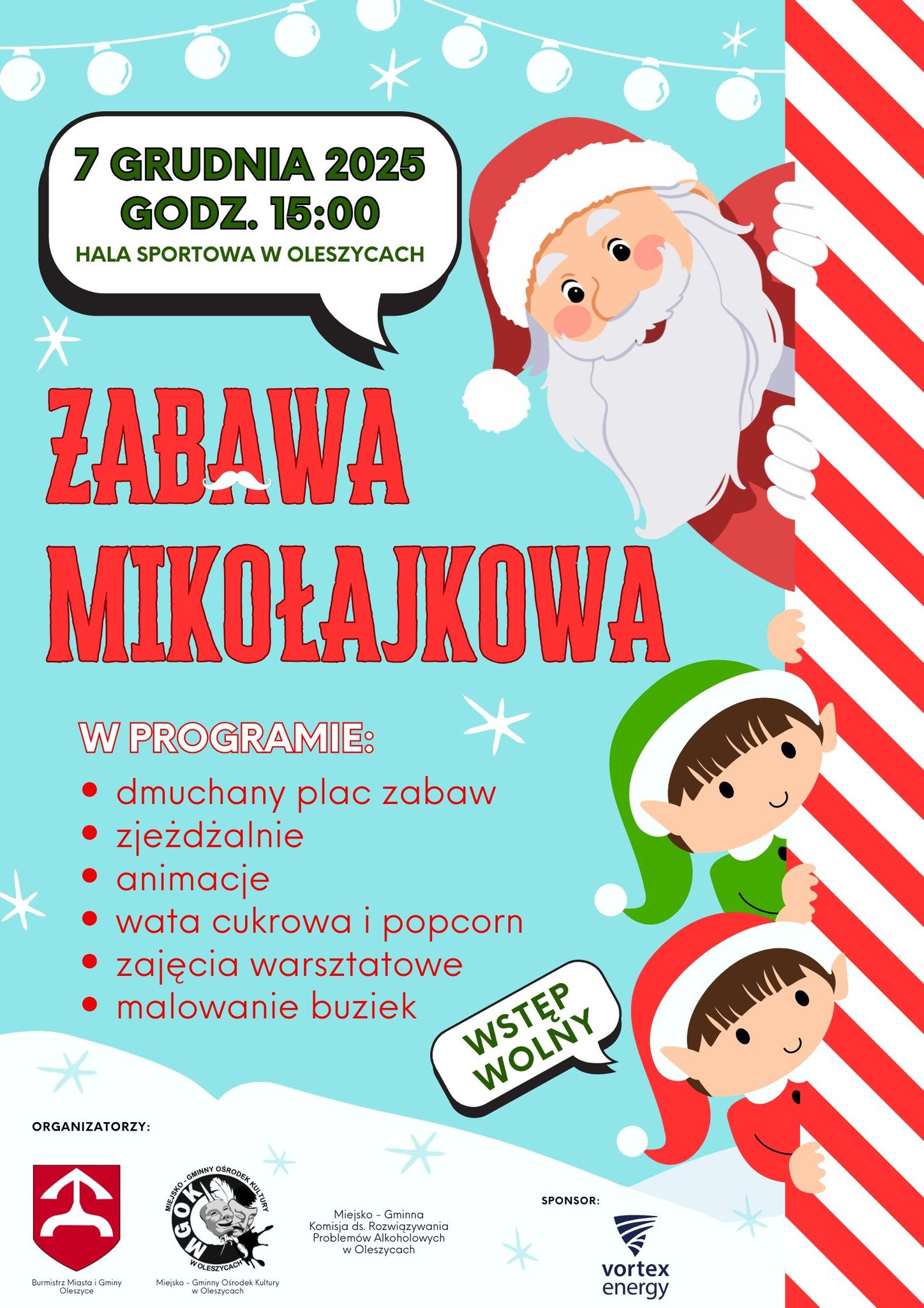 W pierwszą grudniową sobotę Hala Sportowa w Oleszycach zamieni się w pełne świątecznej radości centrum zabawy. 7 grudnia 2025 roku o godzinie 15:00 rozpocznie się „Zabawa Mikołajkowa”, na którą zapraszają Burmistrz Miasta i Gminy Oleszyce oraz Miejsko-Gminny Ośrodek Kultury w Oleszycach. Wstęp na wydarzenie jest bezpłatny.