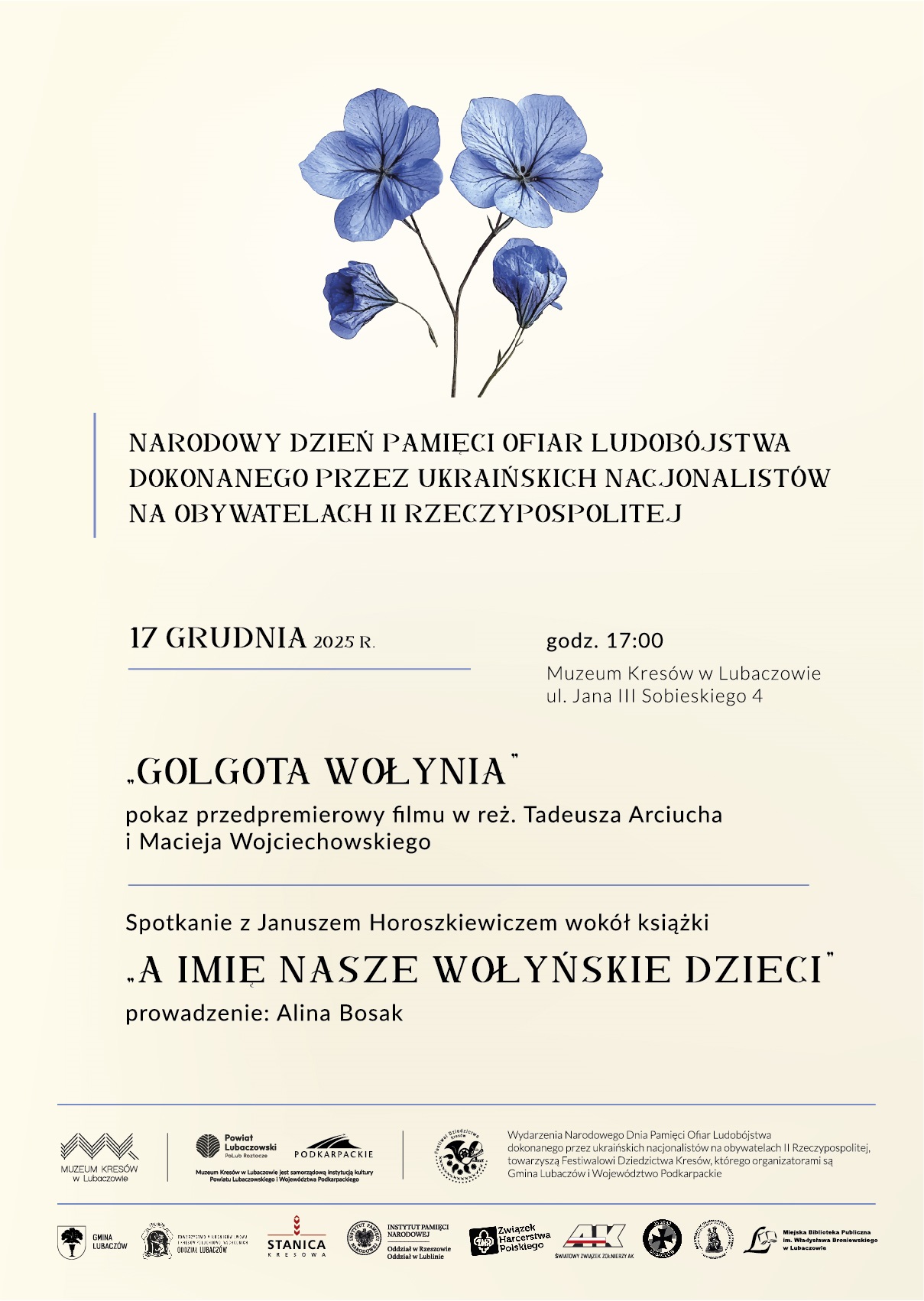 Muzeum Kresów w Lubaczowie zaprasza w środę, 17 grudnia 2025 r. o godz. 17.00, na wyjątkowe wydarzenie poświęcone pamięci o tragicznych losach Polaków na Wołyniu. W programie znajduje się prapremiera filmu „Golgota Wołynia” w reżyserii Tadeusza Arciucha i Macieja Wojciechowskiego oraz spotkanie autorskie z Januszem Horoszkiewiczem, kustoszem pamięci narodowej i autorem książki „A imię nasze wołyńskie dzieci” (2025). Wstęp jest wolny, a po wydarzeniu będzie możliwość zakupu książki z autografem autora.