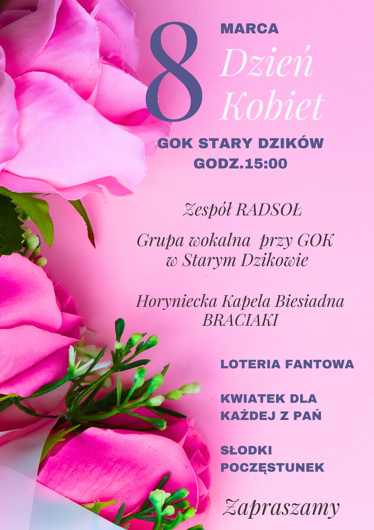Wydarzenie ma być okazją do wspólnego spędzenia czasu w muzycznej oprawie i podkreślenia roli kobiet w życiu lokalnej społeczności. Początek spotkania zaplanowano na godzinę 15:00 w sali widowiskowej GOK w Starym Dzikowie.
