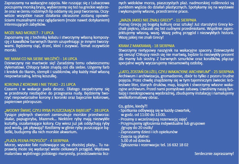 Jak co roku także i w te wakacje Muzeum Kresów w Lubaczowie zaprasza na wakacyjne zajęcia. Tegoroczne spotkania odbędą się po tytułem „Wakacje za jeden uśmiech” inspiracją będą oczywiście wystawy czasowe, gdzie Grecja oraz morskie pejzaże nieodrodnie z wakacjami się kojarzą. Przyjrzymy się także bliżej zabytkom z sal wystawowych oraz tych na co dzień „mieszkających” w magazynie.