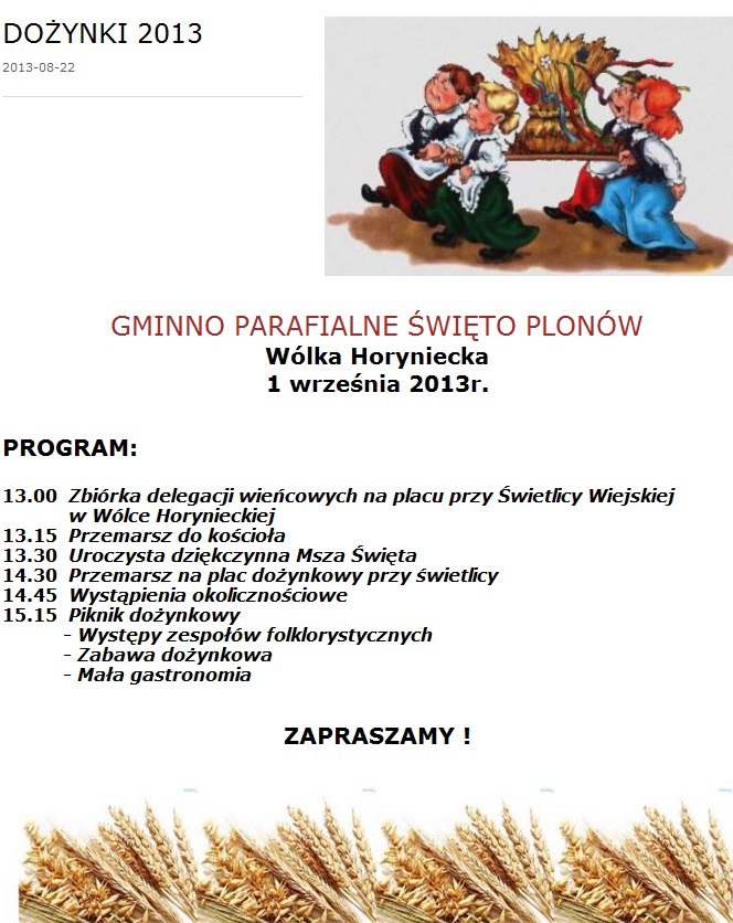 W najbliższą niedzielę (01.09) aż w trzech gminach odbędą się Parafialne Święta Plonów. Możemy wybrać się do Wólki Horynieckiej, Oleszyc lub Moszczanicy.