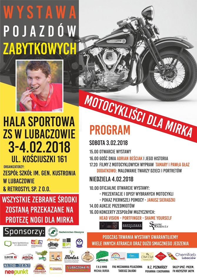 Zjednoczmy siły i pomóżmy Mirkowi, przychodząc na charytatywną wystawę pojazdów zabytkowych w dniach 3-4 luty 2018 do Zespołu Szkół im. gen. J. Kustronia w Lubaczowie, ul Kościuszki 161. Zebrane pieniądze zostaną przeznaczone na zakup protezę dla Mirka.