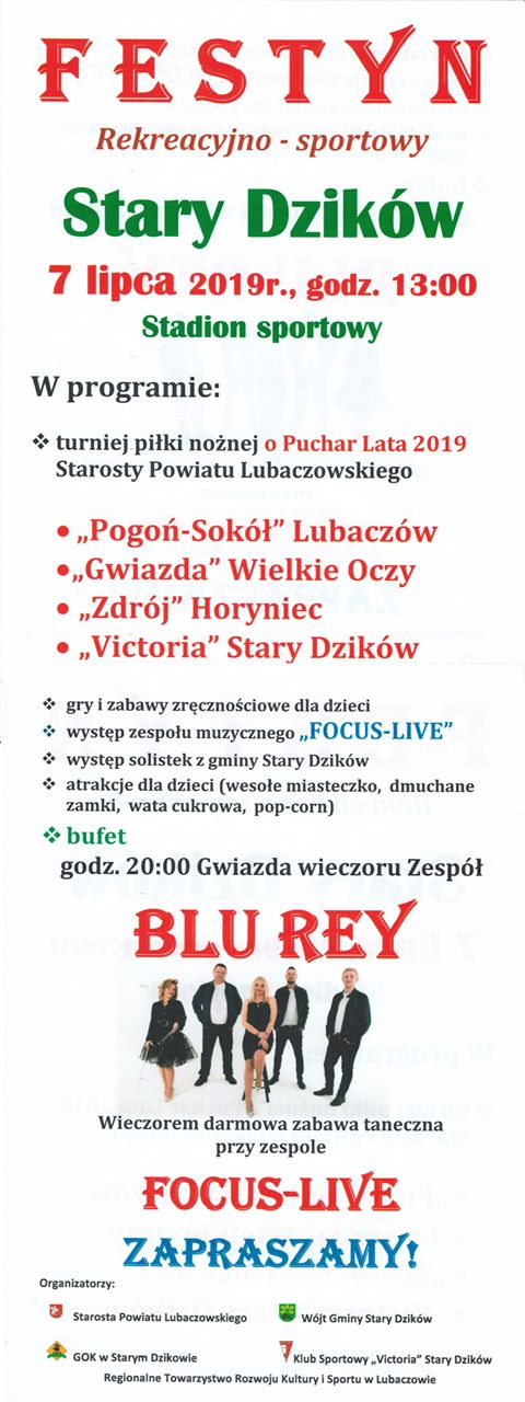 W najbliższą niedzielę (07.07) na stadionie w Startym Dzikowie odbędzie się festyn rekreacyjno-sportowy. W programie między innymi turniej piłki nożnej oraz gry i zabawy zręcznościowe dla dzieci, a także występy solistek z gminy Stary Dzików. Wieczorem koncert gwiazdy wieczoru zespołu Blu Rey.