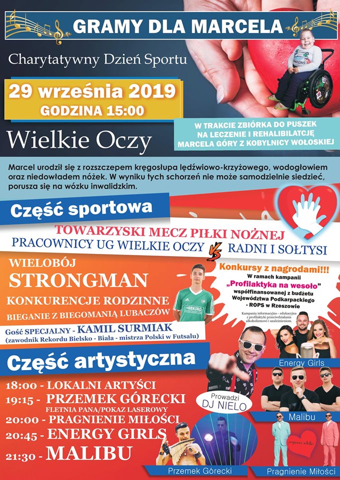W niedzielę 29 września na kompleksie sportowo - rekreacyjnym w Wielkich Oczach odbędzie się Charytatywny Dzień Sportu. W trakcie imprezy zbierane będą pieniądze do puszek na leczenie i rehabilitację Marcela Góry z Kobylnicy Wołoskiej. Początek o godz. 15:00.
