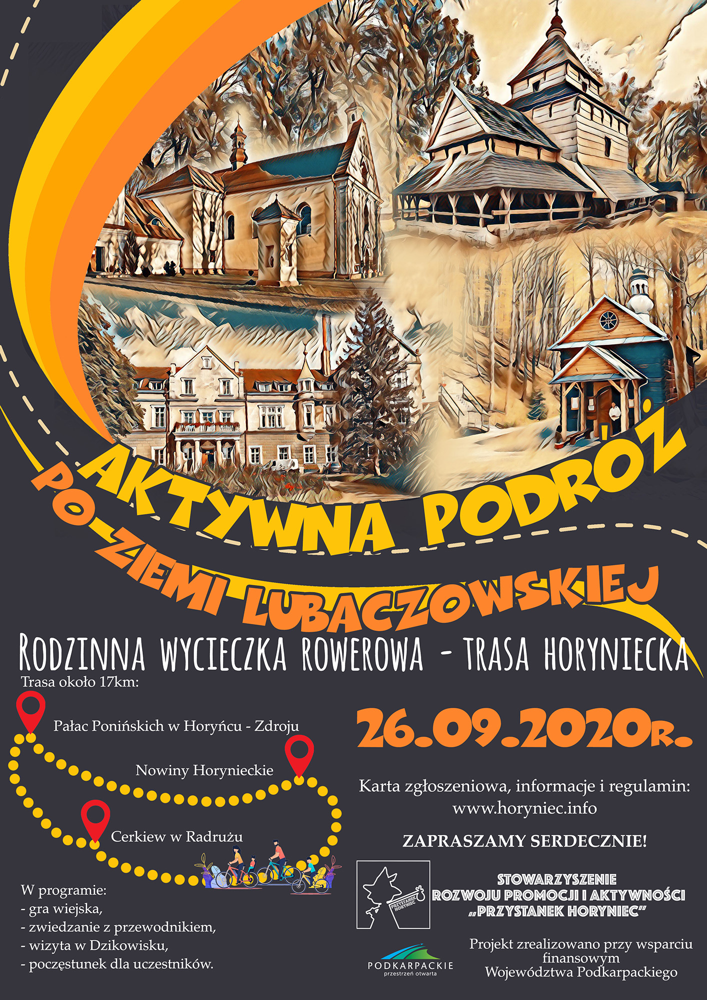 - Trasa horyniecka – odbędzie się 26 września 2020r. Zbiórka na parkingu przy Szkole Podstawowej w Horyńcu – Zdroju, rejestracja uczestników zaczyna się o godzinie 9:00. Trasa wycieczki: Horyniec – Zdrój – Nowiny Horynieckie (Dzikowisko – kapliczka na wodzie) – Horyniec – Zdrój – Radruż. Wycieczka oparta jest na grze wiejskiej podczas której zapoznamy się z osobą Jana III Sobieskiego oraz historii jego polowań w regionie oraz bitwy podczas której pokonał Tatarów. Na uczestników czeka również wizyta w Agroturystyce Dzikowisko w Nowinach Horynieckich gdzie młodsi uczestnicy będą mogli zapoznać się z pracą na gospodarstwie, będą mogli wydoić kozę, a nawet zasmakować kozich serków. Przewidziane jest również zwiedzanie cerkwi w Radrużu z przewodnikiem. Całość zakończy się wspólnym ogniskiem, ciepłym posiłkiem a uczestnicy otrzymają pamiątki z rajdu! Długość trasy około 17 km.
