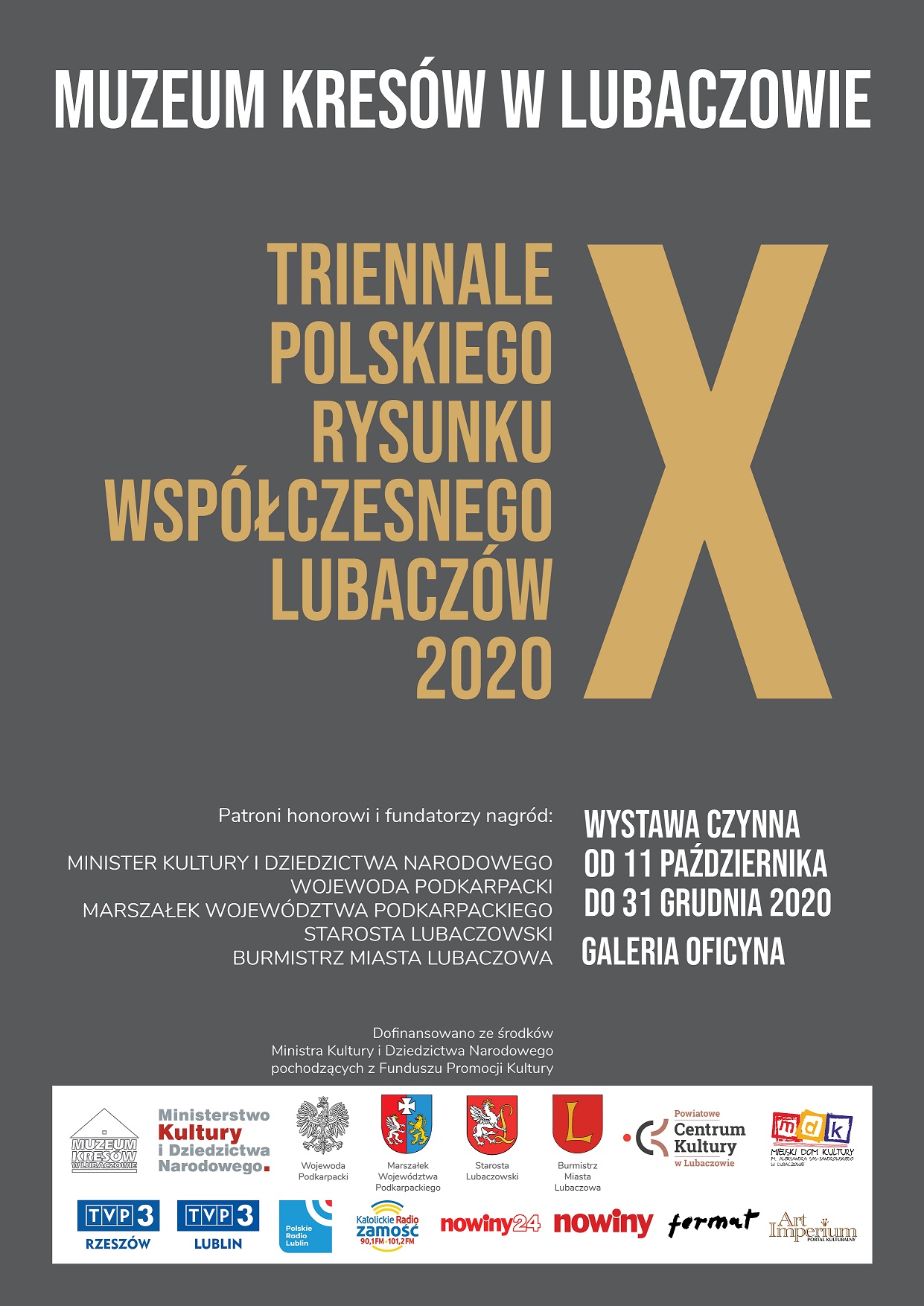 Uroczyste rozstrzygnięcie konkursu X Triennale Polskiego Rysunku Współczesnego Lubaczów 2020 i wernisaż wystawy, do której jury wybrało łącznie 87 rysunków 62 autorów, odbędą się w Galerii Oficyna w Zespole Zamkowo-Parkowym przy Muzeum Kresów w Lubaczowie 11 października 2020 r. o godz. 11. Wydarzeniem towarzyszącym będzie wystawa prezentująca prace laureatów Triennale z lat 1993–2017. Obie ekspozycje będzie można zwiedzać do końca grudnia 2020 r.