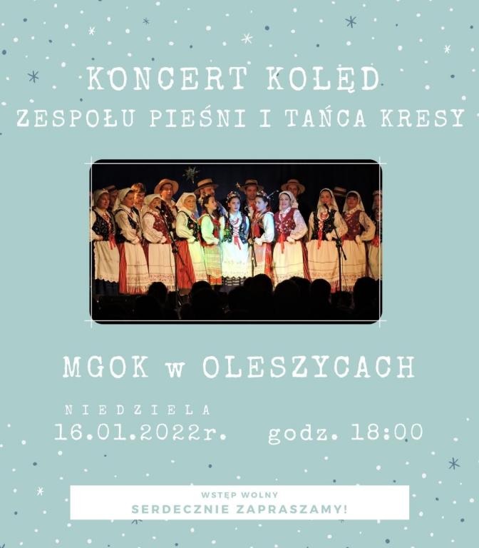 W niedzielę, 16 stycznia w Miejsko Gminnym Ośrodku Kultury w Oleszycach, o godz. 17:00 odbędzie się wernisaż wystawy rysunku Stanisława Sobczyka. Tuż po nim, o godz. 18:00 rozpocznie się Koncert Kolęd w wykonaniu Zespołu Pieśni i Tańca Kresy.