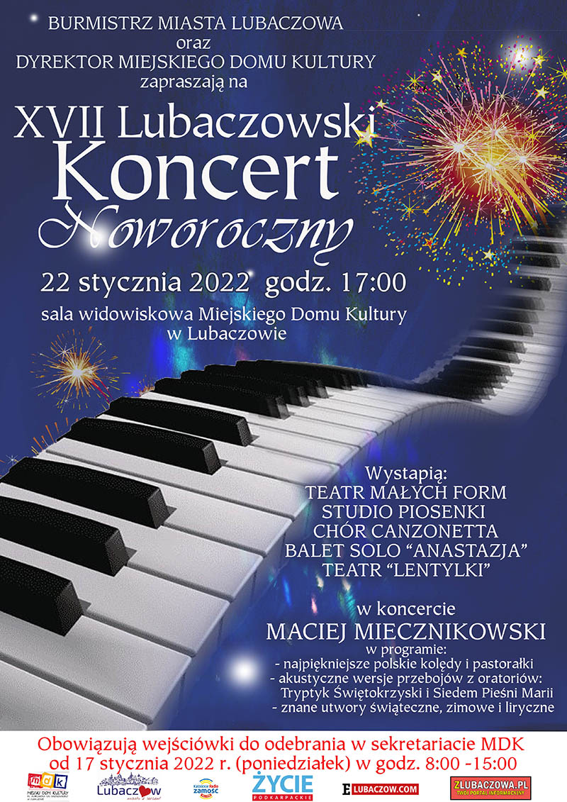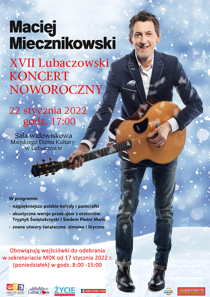 W sobotę 22 stycznia w Lubaczowie po raz siedemnasty odbędzie się Lubaczowski Koncert Noworoczny. To wydarzenie, które od lat przyciąga tłumy widzów. W tym roku gwiazdą wieczoru będzie Maciej Miecznikowski.