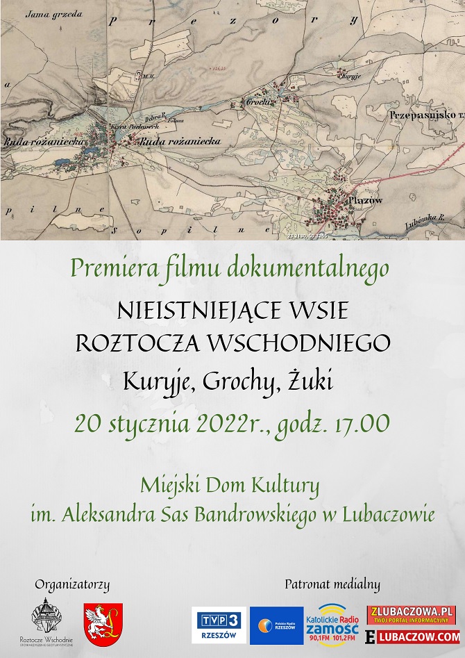 W czwartek 20. stycznia o godz. 17:00 w Kinie „Melodia” przy Miejskim Domu Kultury w Lubaczowie odbędzie się premiera filmu dokumentalnego „Nieistniejące wsie Roztocza Wschodniego- Grochy, Kuryje, Żuki”, którego producentem jest Stowarzyszenie Geoturystyczne „Roztocze Wschodnie” z Lubaczowa. W tym samym dniu o godz. 18:00 film będzie miał swoją premierę online na FB Stowarzyszenia Geoturystycznego „Roztocze Wschodnie” oraz Powiatu Lubaczowskiego.