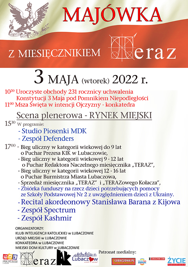 We wtorek 3 maja w Lubaczowie odbędzie się Majówka z miesięcznikiem "Teraz". W programie m.in. biegi uliczne i koncerty.