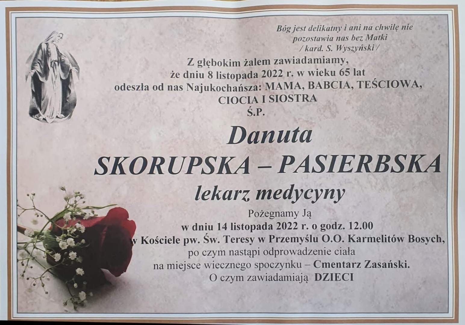 Z przykrością informujemy że, we wtorek 8.11.2022 odeszła na wieczny dyżur lek. med. Danuta Skorupska- Pasierbska, specjalista chirurgii ogólnej i chirurgii onkologicznej. Wieloletni pracownik Szpitalnego Oddziału Ratunkowego w SP ZOZ w Lubaczowie. Pani Danuta była także kierownikiem specjalistycznego Zespołu Ratownictwa Medycznego w Lubaczowie.