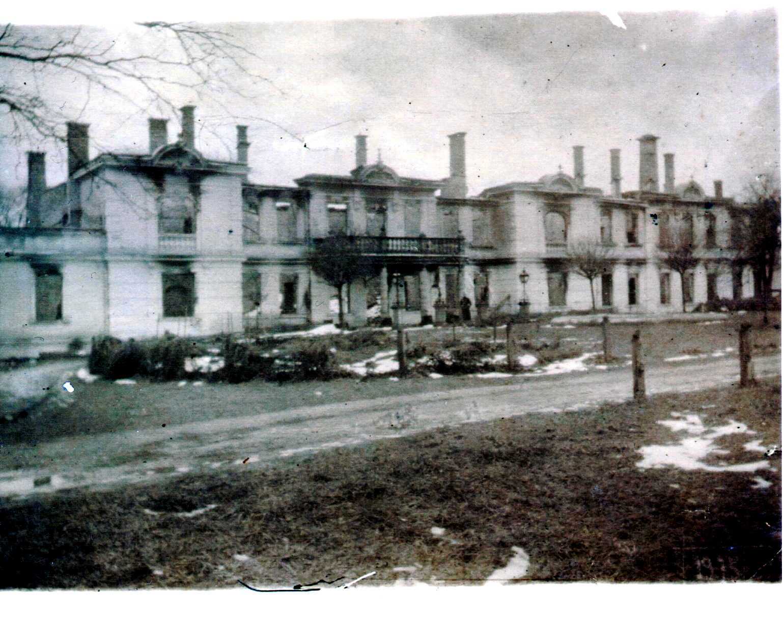 W 1914 pałac został spalony przez Rosjan. Niemal natychmiast po pożarze, przy pomocy jeńców włoskich budynek odbudowano. Nie odtworzono jednak wystroju wewnętrznego wielu pomieszczeń zwłaszcza reprezentacyjnych. Dotyczyło to m.in. holu z kominkiem wyposażonym w drzwiczki z miki. W pokoju jadalnym na parterze zachowała się tylko rozeta nad żyrandolem w postaci promieni słonecznych. Inne sztukaterie wyobrażały amorka i diabła.