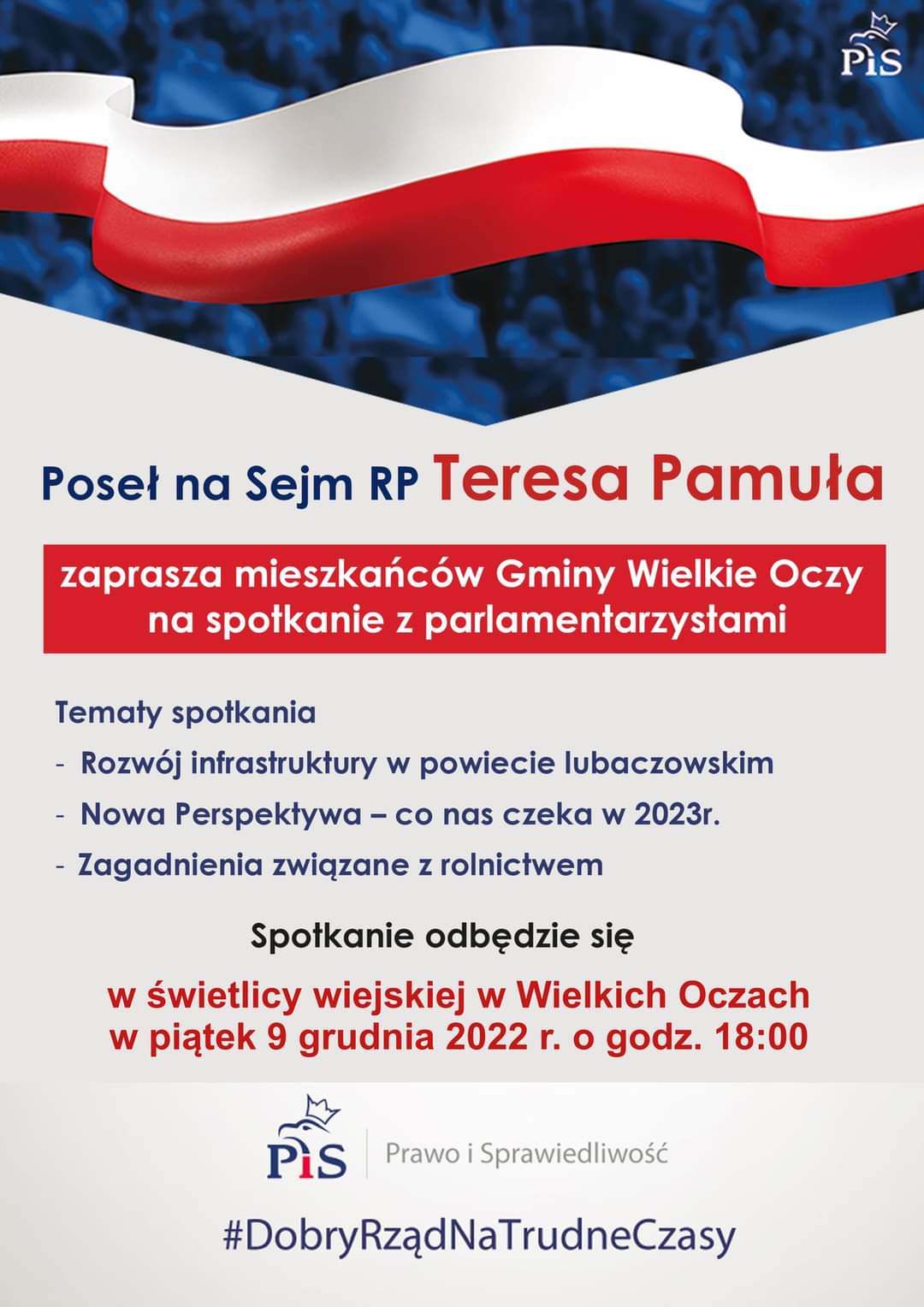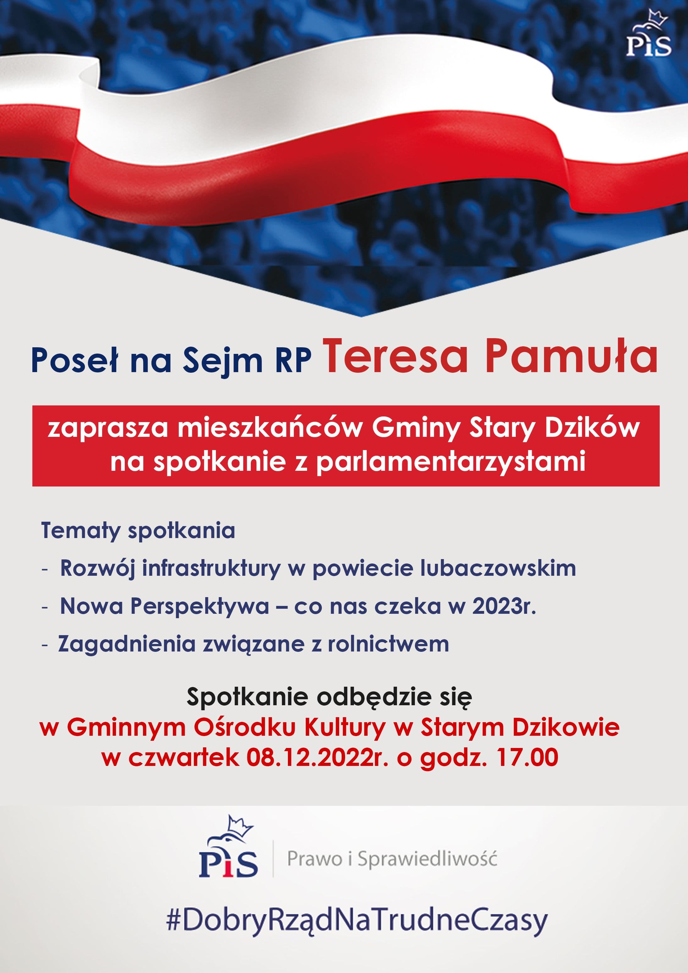 Poseł Teresa Pamuła zaprasza mieszkańców gmin Stary Dzików oraz Wielkie Oczy na spotkania z parlamentarzystami, które odbędą się w czwartek oraz piątek.
