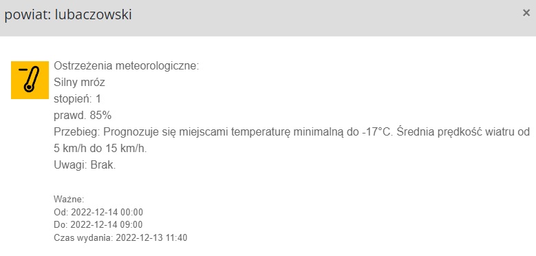 Ostrzeżenie jest ważne od środy od godz. 00:00 do godziny 9:00. Prawdopodobieństwo wystąpienia zjawiska wynosi 85%.