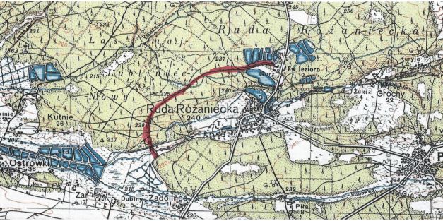 Mapa Rudy Różanieckiej za czasów Wattmana. Na czerwono zaznaczona kolejka torowa z folwarku Jezioro na stawy ,,Sopilne” (na mapie prawdopodobnie w tym czasie stawy zamieniono w pola uprawne czym charakteryzowała się polityka rolna Wattmana. Widoczne zaznaczenie gorzelni i folwarku Jezioro, T-tartak.