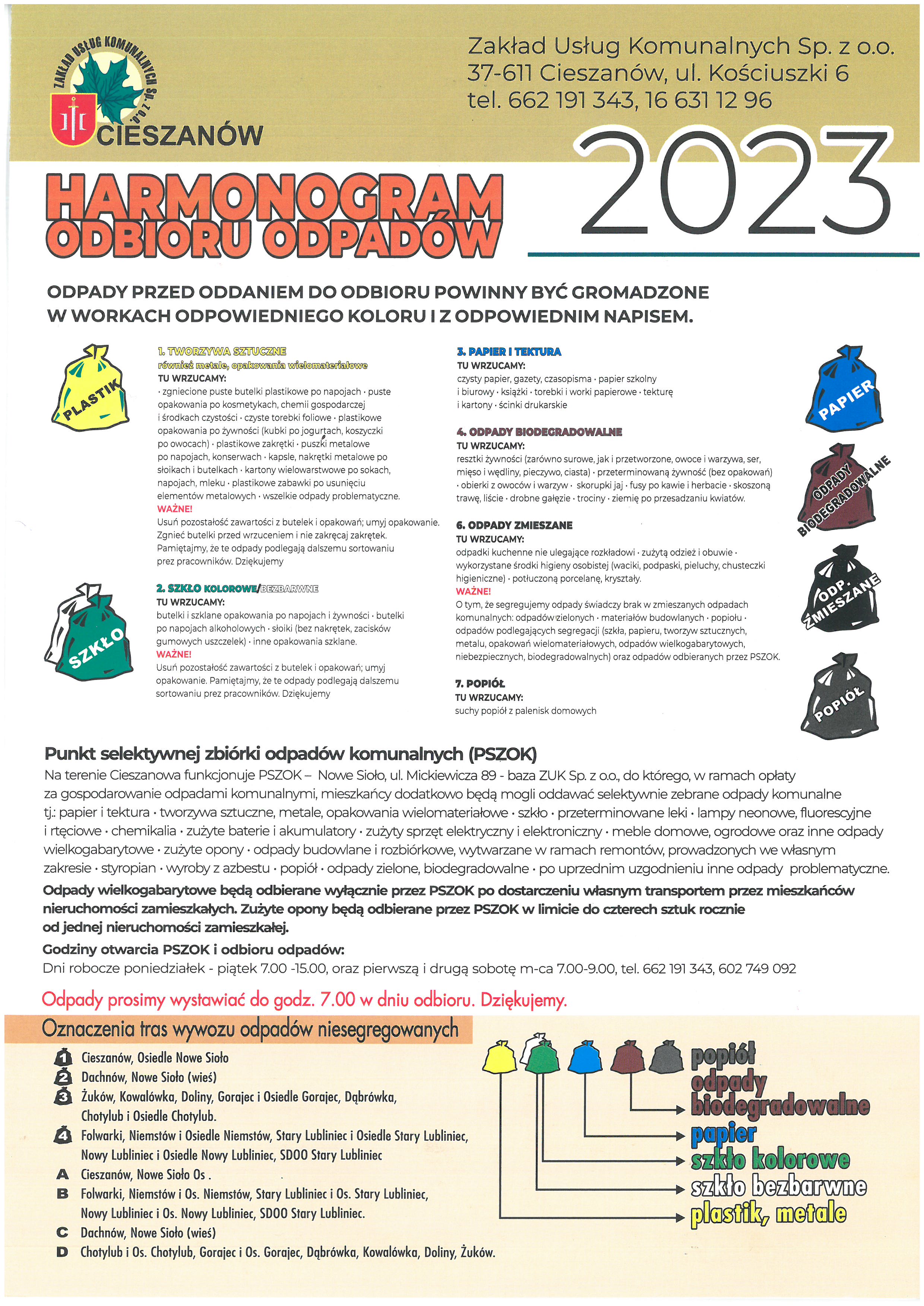 Poniżej znajdziecie harmonogram odbioru odpadów w 2023 roku;
