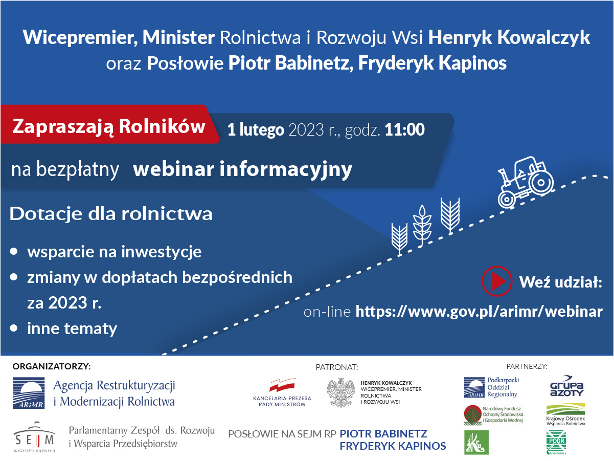 Webinar, który odbędzie się 1 lutego jest organizowany wspólnie przez Centralę ARiMR i Oddziały Regionalne z zespołem parlamentarnym Sejmu RP. Dotyczy możliwości skorzystania z pomocy oferowanej przez ARiMR. W spotkaniu mogą uczestniczyć indywidualni rolnicy, na zadawane przez nich pytania odpowiedzi udzielą eksperci ARiMR.