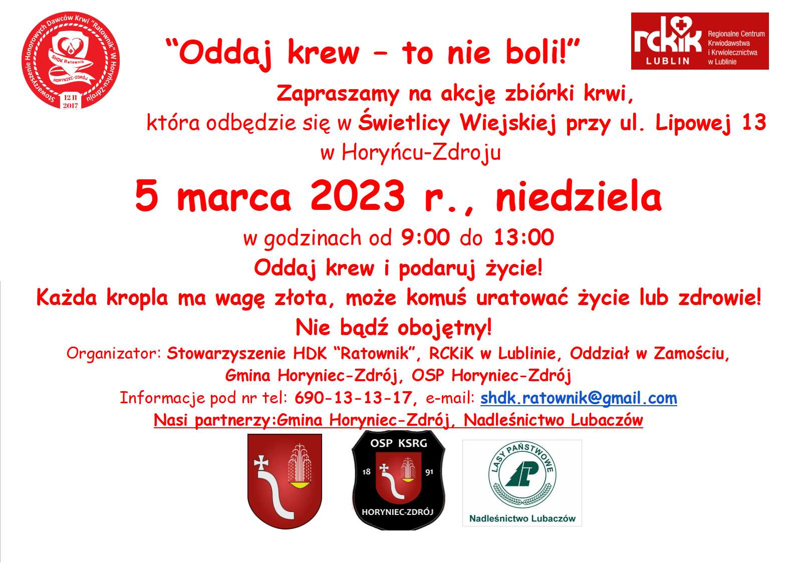 Akcje tradycyjnie odbędą się w Świetlicy Wiejskiej przy ul. Lipowej 13 w Horyńcu-Zdroju w godzinach od 9 do 13.