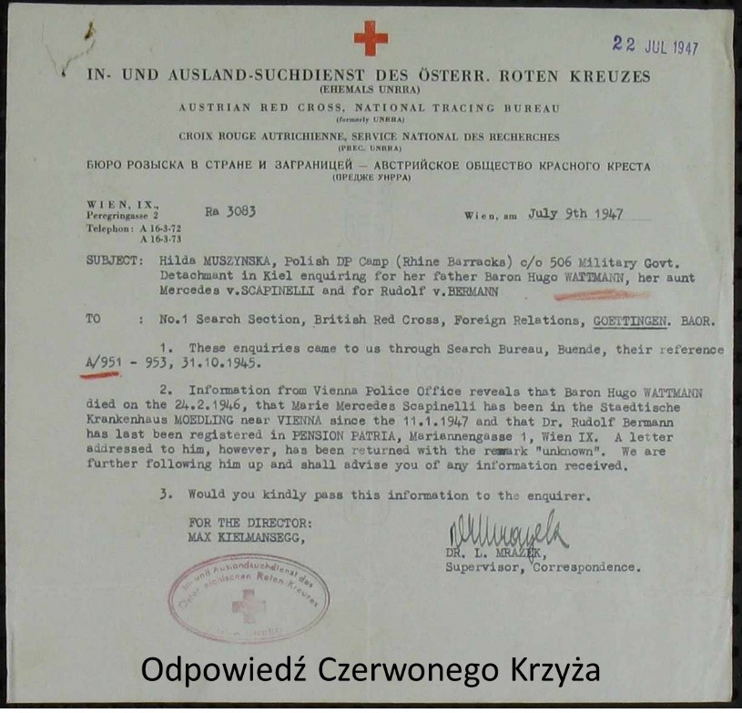 Nazywa się Hugo Baron Wattmann, a jego adres był do marca 1945, kiedy miałam ostatni list od niego z obozu koncentracyjnego Wien VIII Hameslingplatz 2. Nie wiem, co się z nim stało po marca.