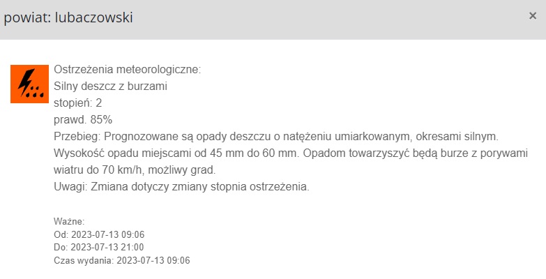 W tej sprawie wydano też alert RCB. Dzisiaj mieszkańcy powiatu lubaczowskiego otrzymali smsy o następującej treści: Uwaga! Dziś (13.07) intensywne opady deszczu. Możliwe gwałtowne wezbrania rzek. Przygotuj się na ewentualnie podtopienia. Śledź komunikaty pogodowe.