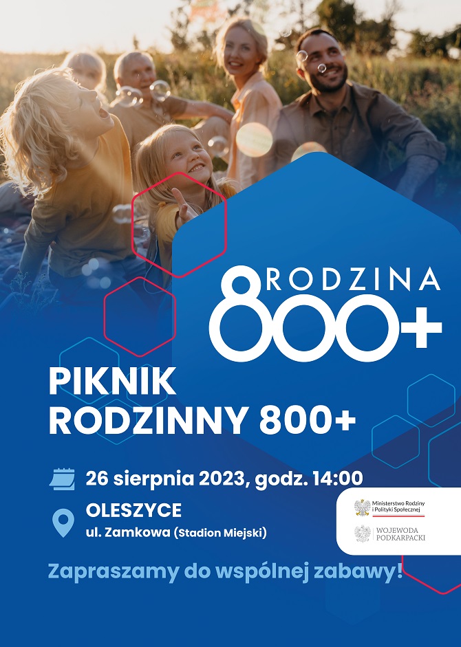 Ministerstwo Rodziny i Polityki Społecznej, Podkarpacki Urząd Wojewódzki oraz poseł Teresa Pamuła zapraszają na piknik Rodzina 800+, który odbędzie się już w najbliższą sobotę (26.08) na stadionie sportowym w Oleszycach.