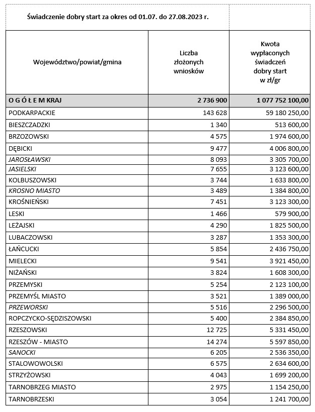 „Od roku szkolnego (2021/2022) to Zakład Ubezpieczeń Społecznych przyznaje i wypłaca świadczenie z programu +Dobry Start+, czyli tzw. 300 plus na wyprawkę szkolną. W ramach programu rodzice - bez względu na dochody - mogą otrzymać jednorazowo 300 zł na zakup podręczników, zeszytów oraz wszelkiego wyposażenia niezbędnego do nauki w szkołach i innych placówkach edukacyjnych. Aktualnie na Podkarpaciu złożonych zostało już 143 tys. Wniosków,