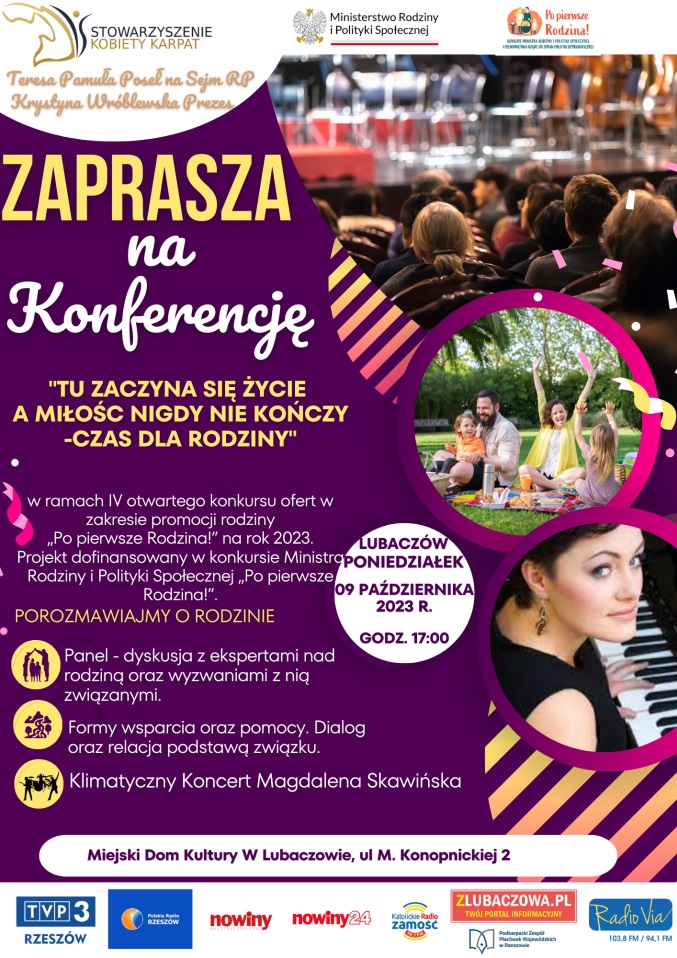 W najbliższy poniedziałek (09.10) w Miejskim Domu Kultury w Lubaczowie odbędzie się konferencja dotycząca rodziny oraz wyzwaniami z nią związanymi. Na koniec przewidziano koncert Magdaleny Skawińskiej.
